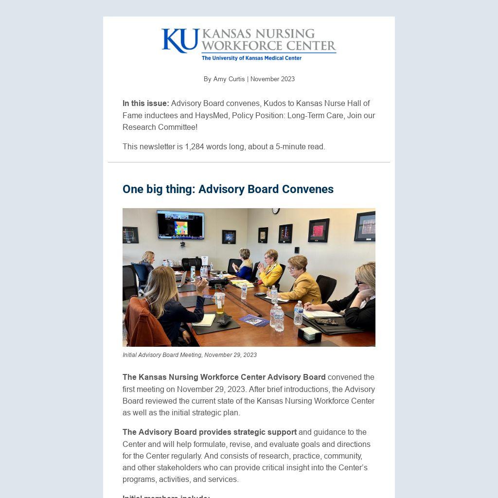 The Kansas Nursing Workforce Center Advisory Board convened the first meeting on November 29, 2023. After brief introductions, the Advisory Board reviewed the current state of the Kansas Nursing Workforce Center as well as the initial strategic plan.