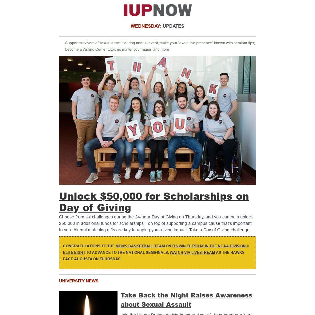 Distributed to IUP employees and students three days a week, IUP Now is the official newsletter of Indiana University of Pennsylvania. It features news from across the IUP website, compiled by the Division of Marketing and Communications. Find out how to get your news and events in IUP Now.
