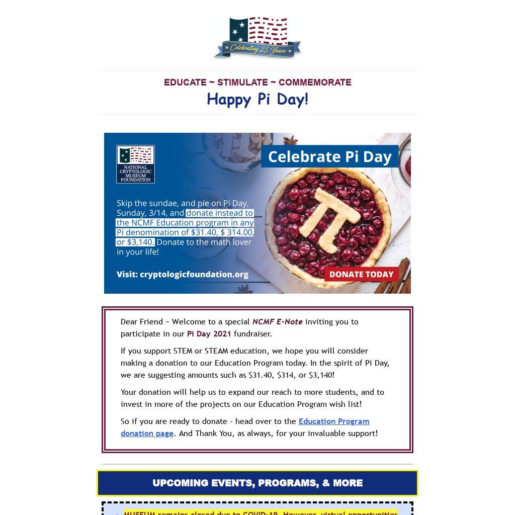 Dear Friend ~ Welcome to a special NCMF E-Note inviting you to participate in our Pi Day 2021 fundraiser.