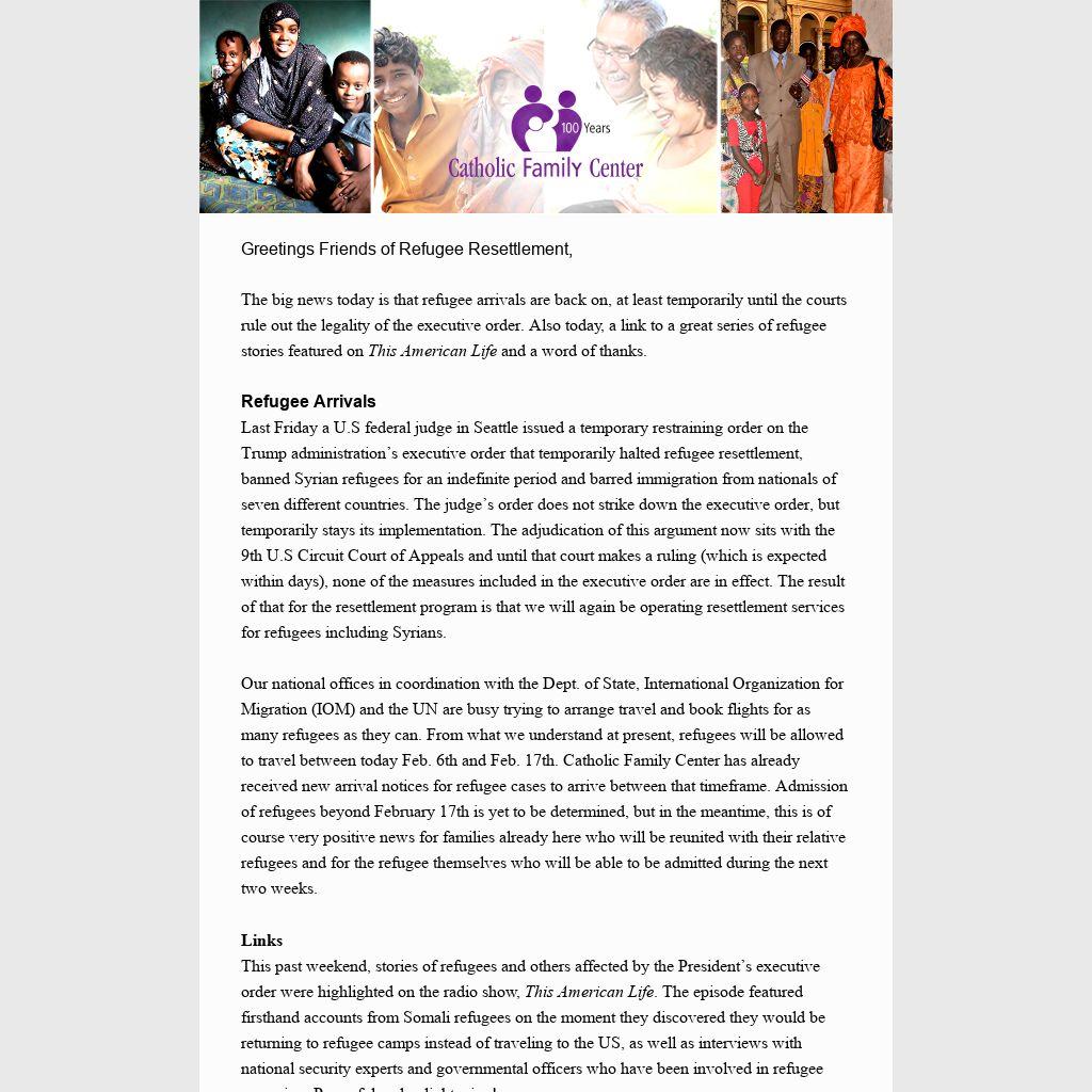 Our national offices in coordination with the Dept. of State, International Organization for Migration (IOM) and the UN are busy trying to arrange travel and book flights for as many refugees as they can. From what we understand at present, refugees will be allowed to travel between today Feb. 6th and Feb. 17th. Catholic Family Center has already received new arrival notices for refugee cases to arrive between that timeframe. Admission of refugees beyond February 17th is yet to be determined, but in the meantime, this is of course very positive news for families already here who will be reunited with their relative refugees and for the refugee themselves who will be able to be admitted during the next two weeks.