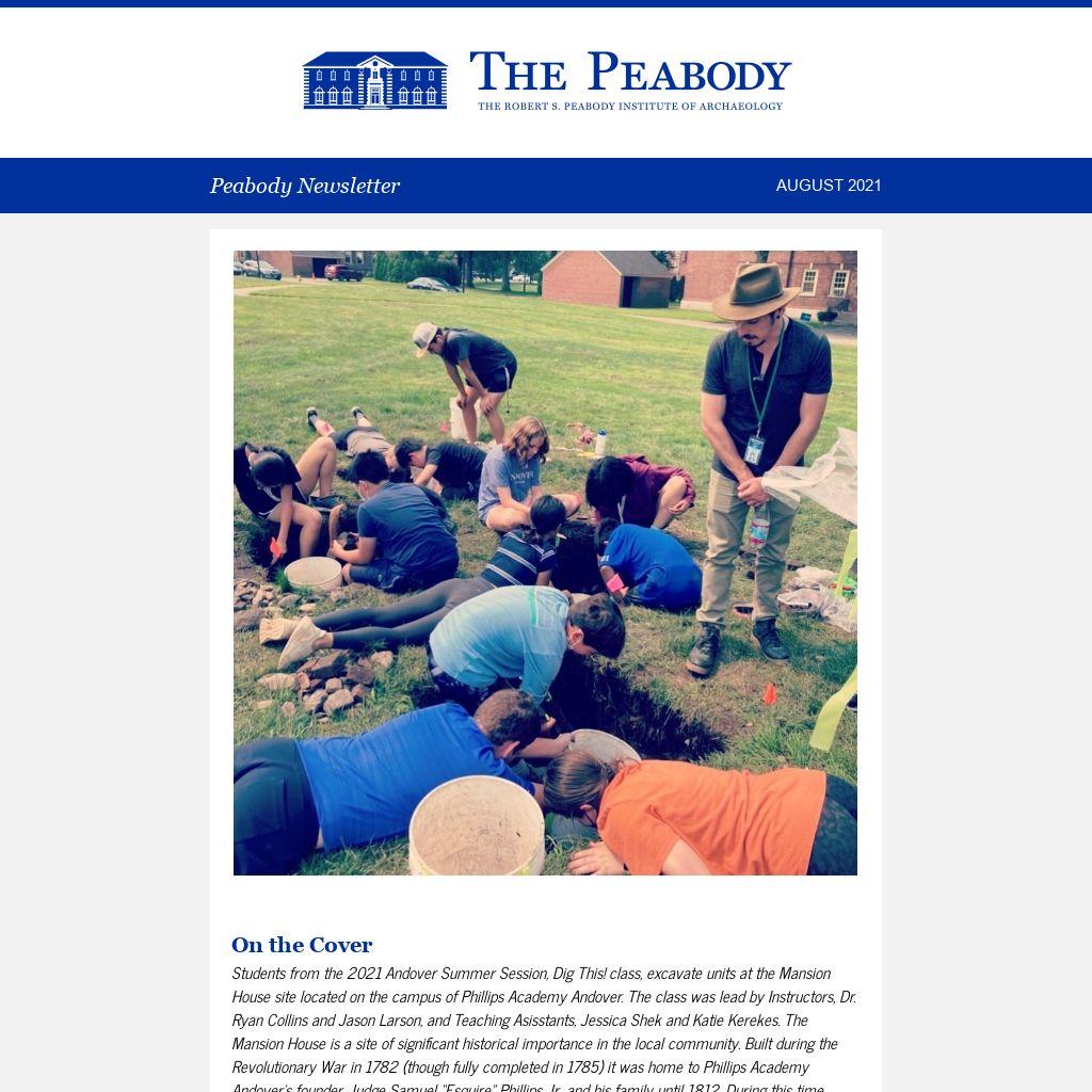 The summer is anything but slow at the Peabody Institute! Explore this month’s newsletter, including updates on summer session, volunteers, and what it’s like to be back at the Peabody, the third season of Diggin’ In, Emily Hurley’s recap of the podcasts that have kept her company in the Peabody basement, and our intern Adam Way’s research on The Phillipian!