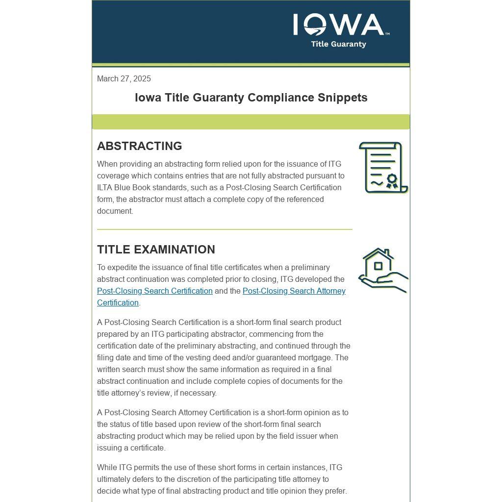 To expedite the issuance of final title certificates when a preliminary abstract continuation was completed prior to closing, ITG developed the Post-Closing Search Certification and the Post-Closing Search Attorney Certification.