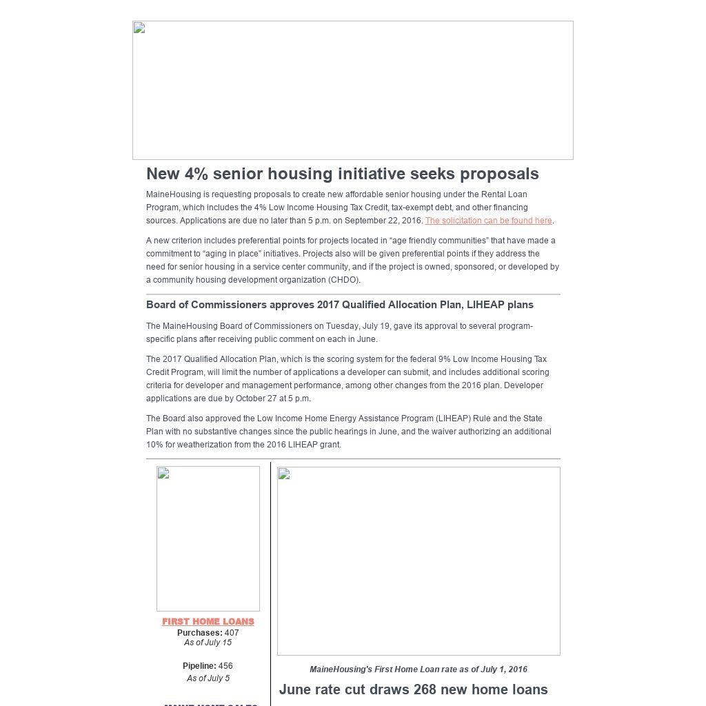 MaineHousing is requesting proposals to create new affordable senior housing under the Rental Loan Program, which includes the 4% Low Income Housing Tax Credit, tax-exempt debt, and other financing sources. Applications are due no later than 5 p.m. on September 22, 2016. The solicitation can be found here.