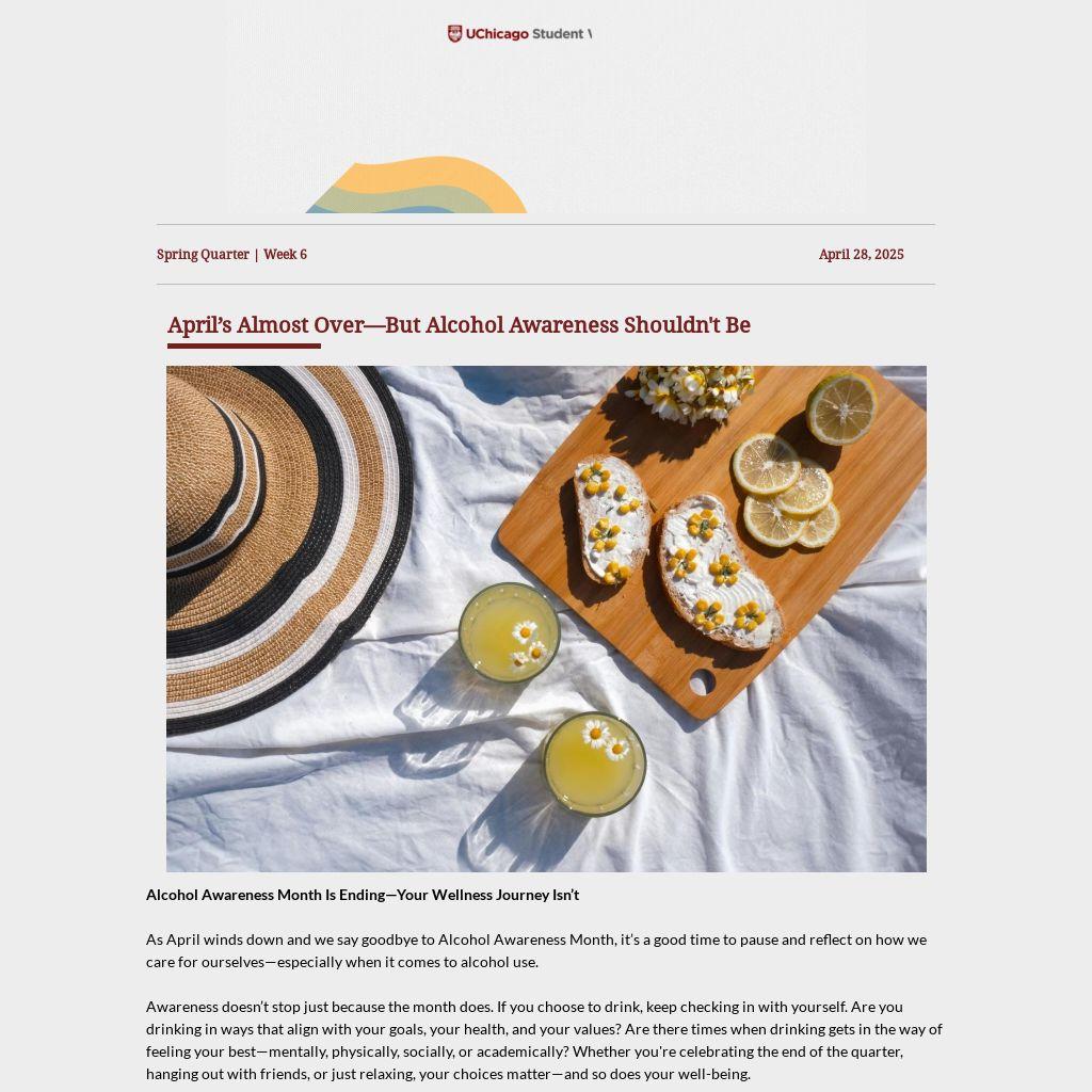 Awareness doesnât stop just because the month does. If you choose to drink, keep checking in with yourself. Are you drinking in ways that align with your goals, your health, and your values? Are there times when drinking gets in the way of feeling your bestâmentally, physically, socially, or academically? Whether you're celebrating the end of the quarter, hanging out with friends, or just relaxing, your choices matterâand so does your well-being.