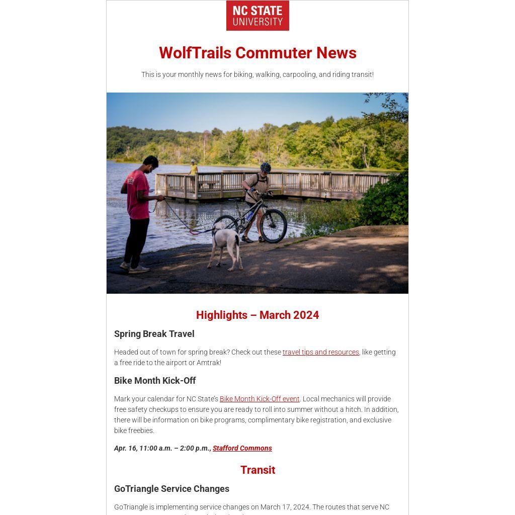 Mark your calendar for NC State’s Bike Month Kick-Off event. Local mechanics will provide free safety checkups to ensure you are ready to roll into summer without a hitch. In addition, there will be information on bike programs, complimentary bike registration, and exclusive bike freebies.
