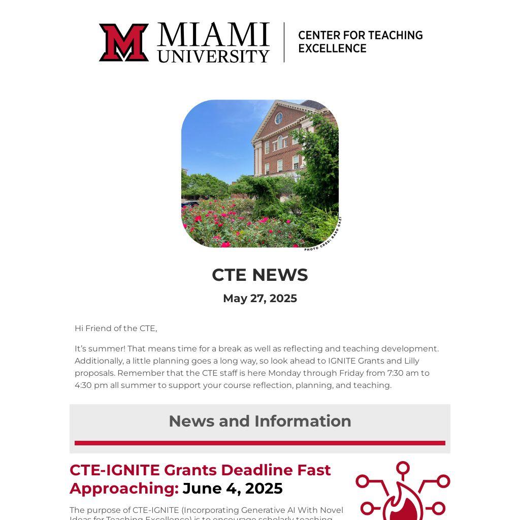 It’s summer! That means time for a break as well as reflecting and teaching development. Additionally, a little planning goes a long way, so look ahead to IGNITE Grants and Lilly proposals. Remember that the CTE staff is here Monday through Friday from 7:30 am to 4:30 pm all summer to support your course reflection, planning, and teaching.