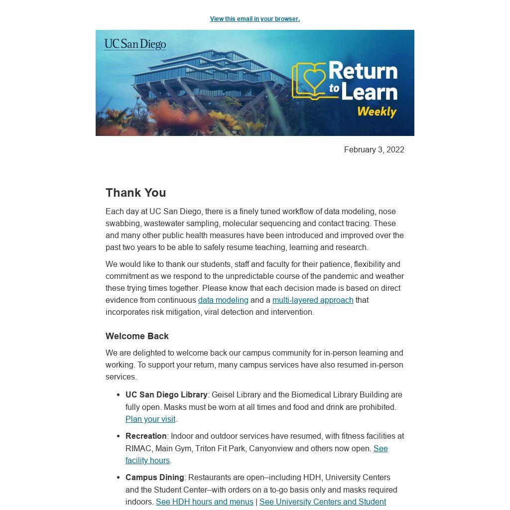 - Recreation: Indoor and outdoor services have resumed, with fitness facilities at RIMAC, Main Gym, Triton Fit Park, Canyonview and others now open. See facility hours.