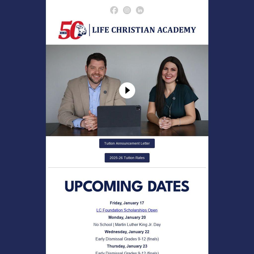 Life Christian Foundation exists to support our students with scholarships and programs. We are gearing up for our 2025-2026 year, and we have a wide variety of scholarships to offer to our students, including two new scholarships. Last year we awarded 75 scholarships to Life Christian Academy students.