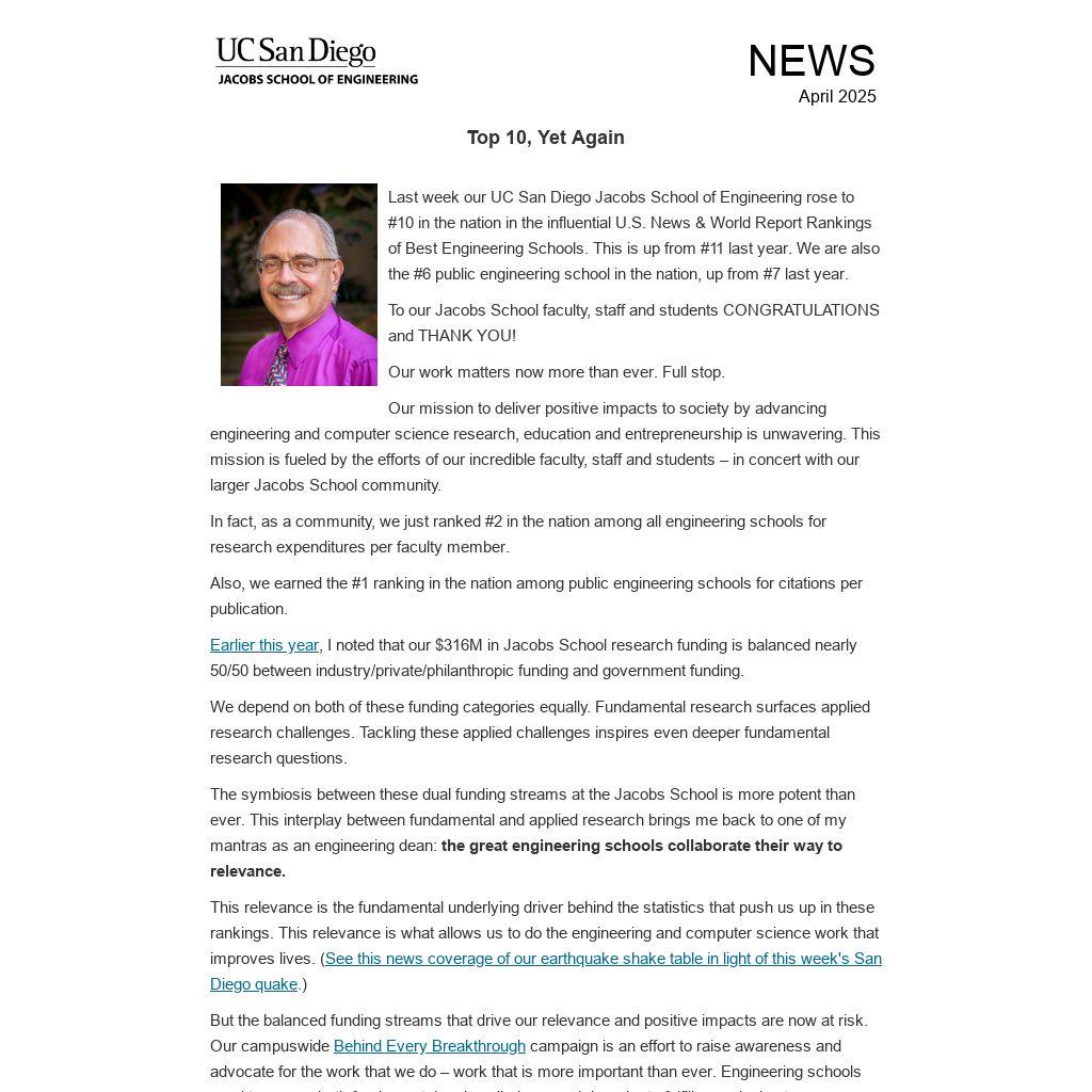 Last week our UC San Diego Jacobs School of Engineering rose to #10 in the nation in the influential U.S. News & World Report Rankings of Best Engineering Schools. This is up from #11 last year. We are also the #6 public engineering school in the nation, up from #7 last year.