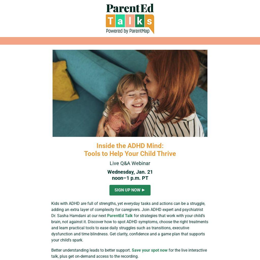ParentMap has partnered with over 270 schools and organizations to offer families free access to our talks. A promo code is required to redeem your tickets — check here to see if your school or organization is a member, or encourage them to sign up.
