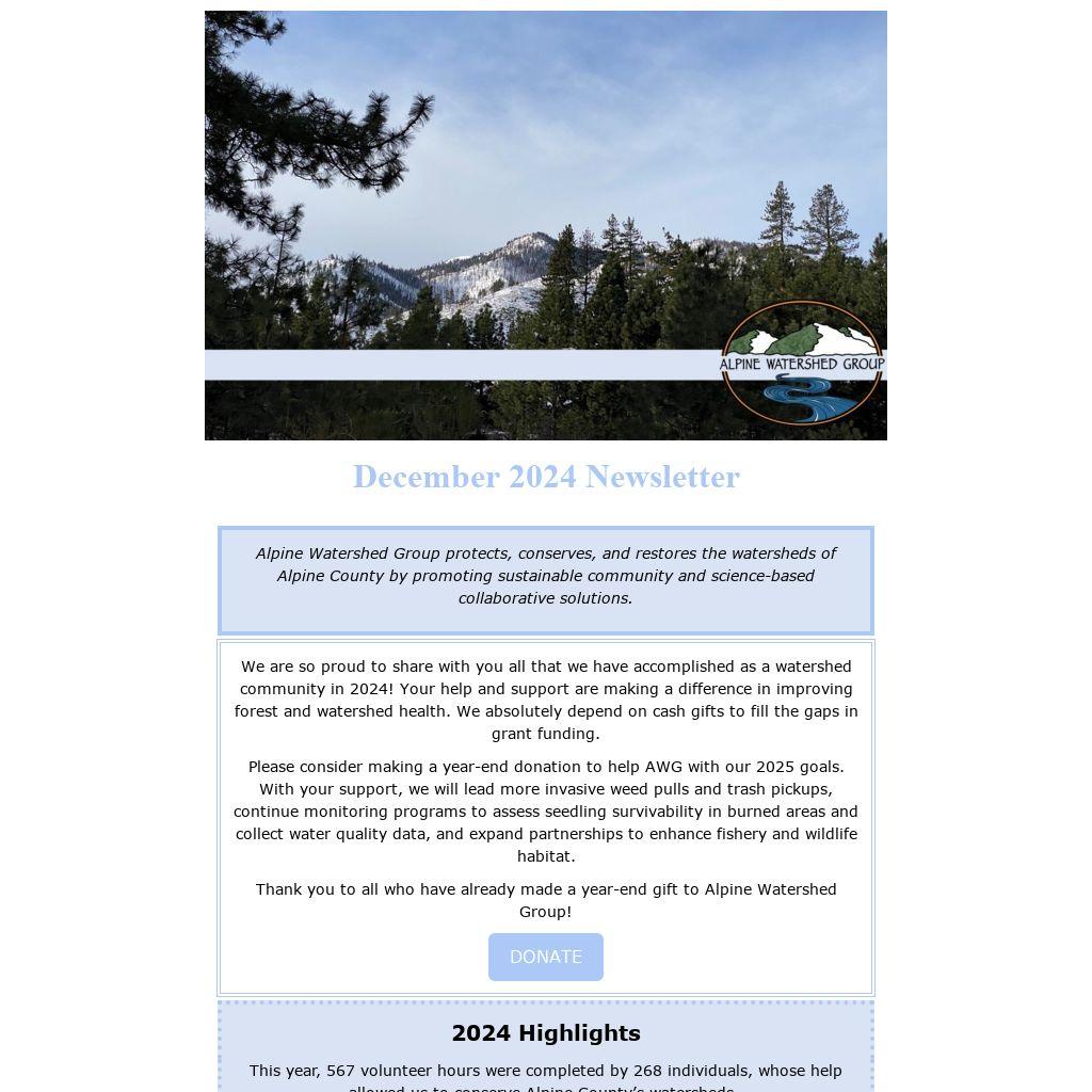 Please consider making a year-end donation to help AWG with our 2025 goals. With your support, we will lead more invasive weed pulls and trash pickups, continue monitoring programs to assess seedling survivability in burned areas and collect water quality data, and expand partnerships to enhance fishery and wildlife habitat.