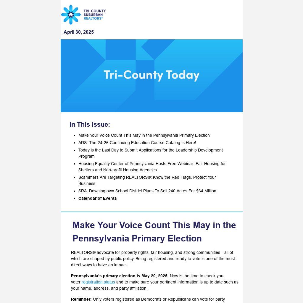 REALTORS® advocate for property rights, fair housing, and strong communities—all of which are shaped by public policy. Being registered and ready to vote is one of the most direct ways to have an impact.