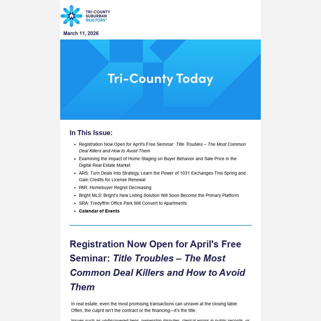 That’s why Tri-County Suburban REALTORS® is hosting Title Troubles: The Most Common Deal Killers and How to Avoid Them, on April 8th at 11 am, to offer an educational session with two seasoned title professionals, designed to help REALTORS® navigate one of the most critical, and often overlooked, parts of the transaction process.