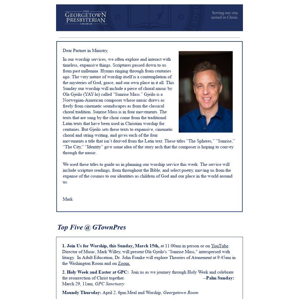 1. Join Us for Worship, this Sunday, March 15th, at 11:00am in person or on YouTube. Director of Music, Mark Willey, will present Ola Gjeilo's “Sunrise Mass," interspersed with liturgy. In Adult Education, Dr. John Franke will explore Theories of Atonement at 9:45am in the Washington Room and on Zoom.