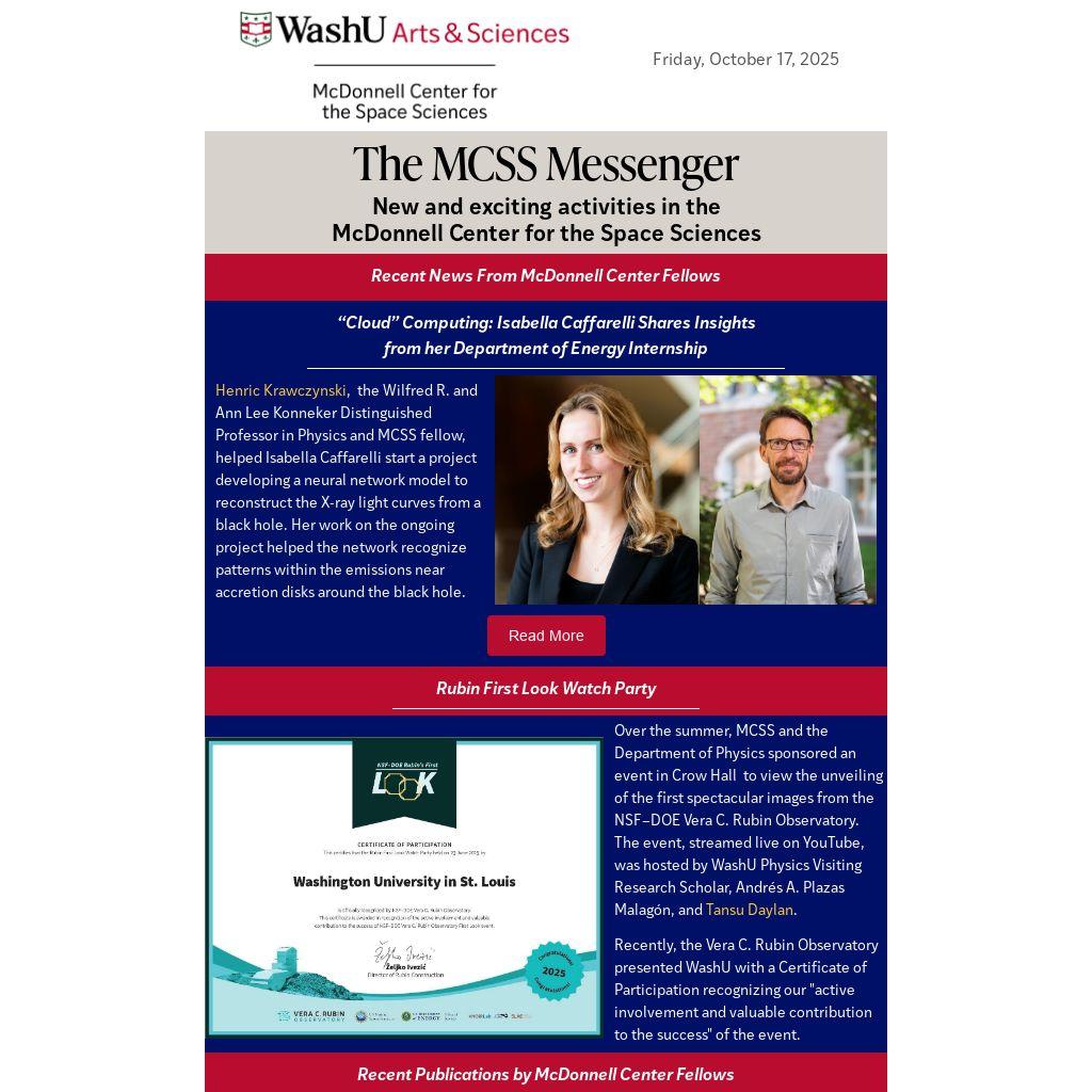 Over the summer, MCSS and the Department of Physics sponsored an event in Crow Hall to view the unveiling of the first spectacular images from the NSF–DOE Vera C. Rubin Observatory. The event, streamed live on YouTube, was hosted by WashU Physics Visiting Research Scholar, Andrés A. Plazas Malagón, and Tansu Daylan.