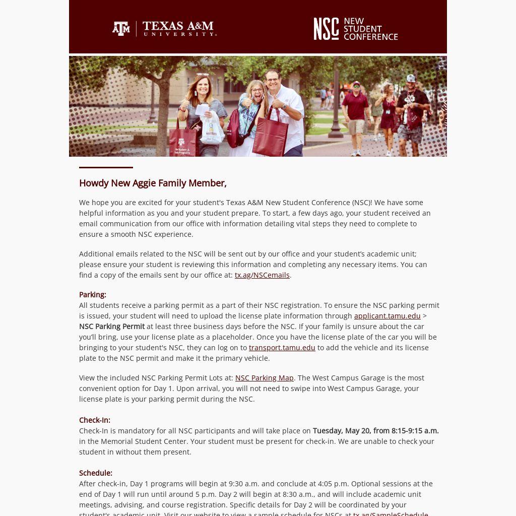 We hope you are excited for your student's Texas A&M New Student Conference (NSC)! We have some helpful information as you and your student prepare. To start, a few days ago, your student received an email communication from our office with information detailing vital steps they need to complete to ensure a smooth NSC experience.
