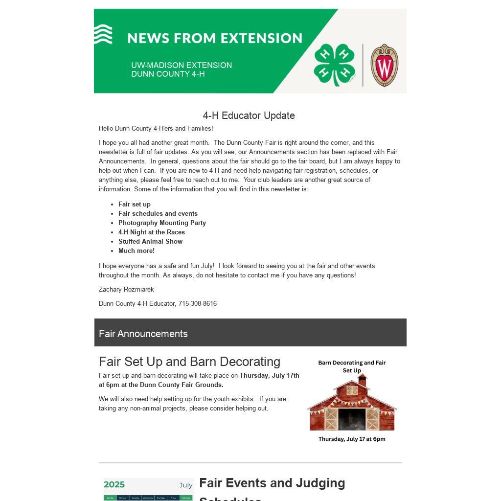 I hope you all had another great month. The Dunn County Fair is right around the corner, and this newsletter is full of fair updates. As you will see, our Announcements section has been replaced with Fair Announcements. In general, questions about the fair should go to the fair board, but I am always happy to help out when I can. If you are new to 4-H and need help navigating fair registration, schedules, or anything else, please feel free to reach out to me. Your club leaders are another great source of information. Some of the information that you will find in this newsletter is: