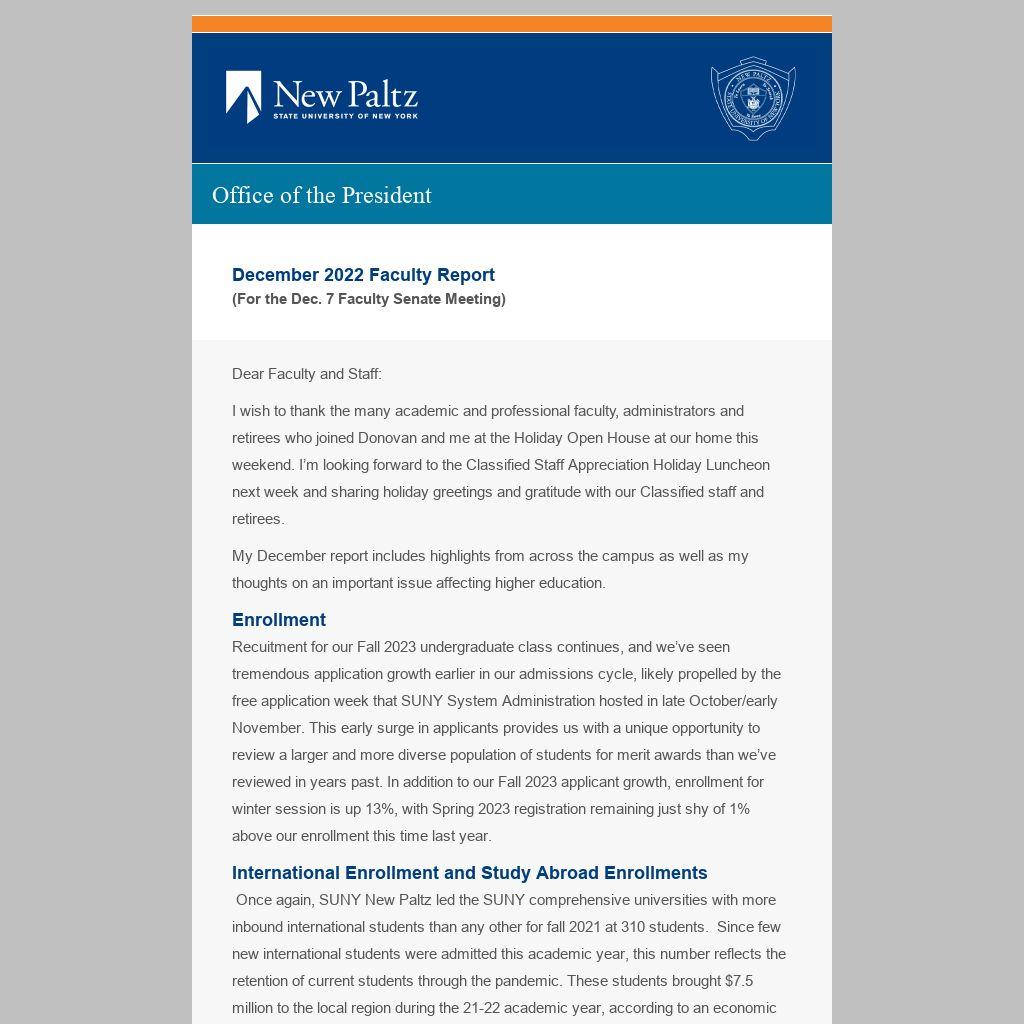Recuitment for our Fall 2023 undergraduate class continues, and we’ve seen tremendous application growth earlier in our admissions cycle, likely propelled by the free application week that SUNY System Administration hosted in late October/early November. This early surge in applicants provides us with a unique opportunity to review a larger and more diverse population of students for merit awards than we’ve reviewed in years past. In addition to our Fall 2023 applicant growth, enrollment for winter session is up 13%, with Spring 2023 registration remaining just shy of 1% above our enrollment this time last year.