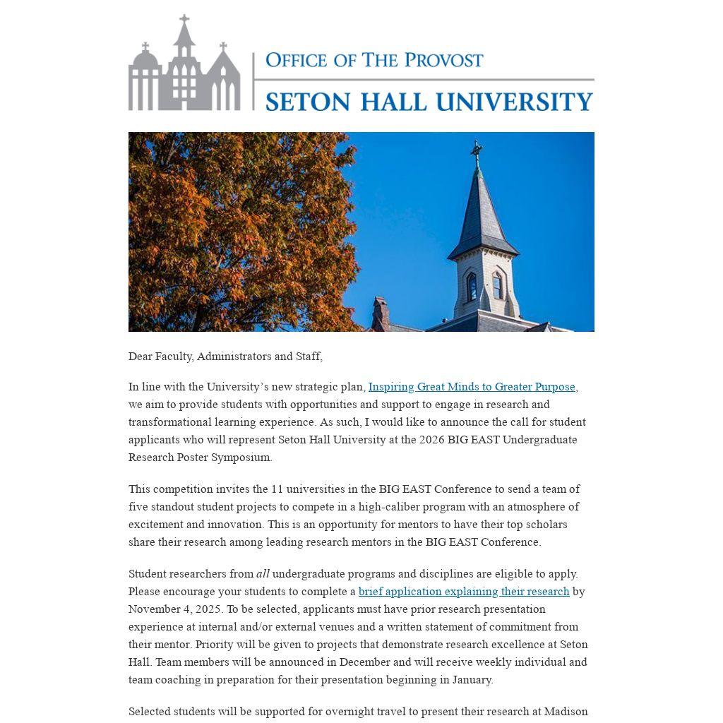 In line with the University’s new strategic plan, Inspiring Great Minds to Greater Purpose, we aim to provide students with opportunities and support to engage in research and transformational learning experience. As such, I would like to announce the call for student applicants who will represent Seton Hall University at the 2026 BIG EAST Undergraduate Research Poster Symposium.