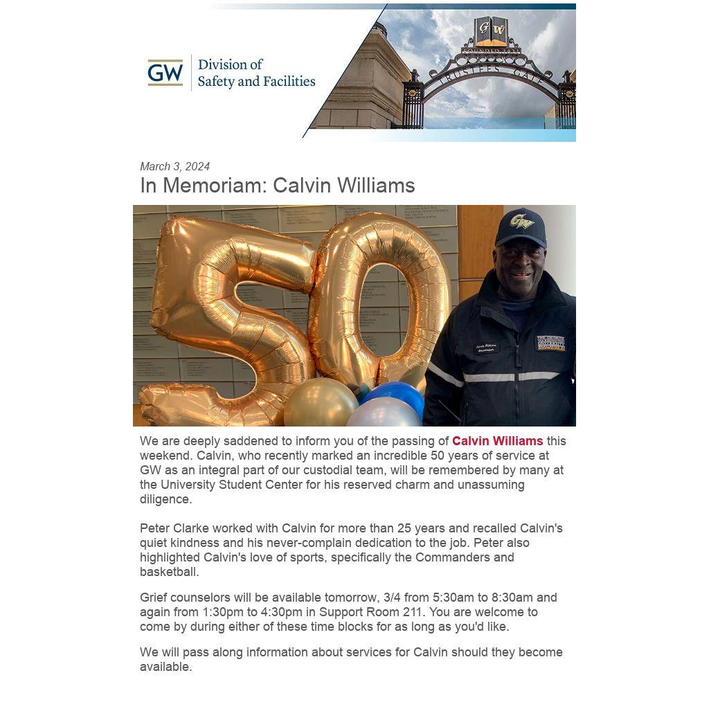We are deeply saddened to inform you of the passing of Calvin Williams this weekend. Calvin, who recently marked an incredible 50 years of service at GW as an integral part of our custodial team, will be remembered by many at the University Student Center for his reserved charm and unassuming diligence.