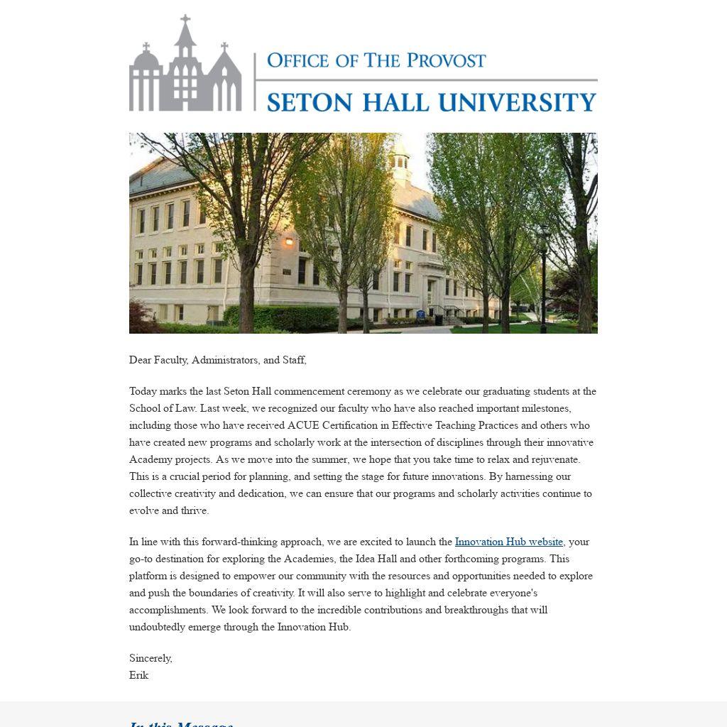 Today marks the last Seton Hall commencement ceremony as we celebrate our graduating students at the School of Law. Last week, we recognized our faculty who have also reached important milestones, including those who have received ACUE Certification in Effective Teaching Practices and others who have created new programs and scholarly work at the intersection of disciplines through their innovative Academy projects. As we move into the summer, we hope that you take time to relax and rejuvenate. This is a crucial period for planning, and setting the stage for future innovations. By harnessing our collective creativity and dedication, we can ensure that our programs and scholarly activities continue to evolve and thrive.