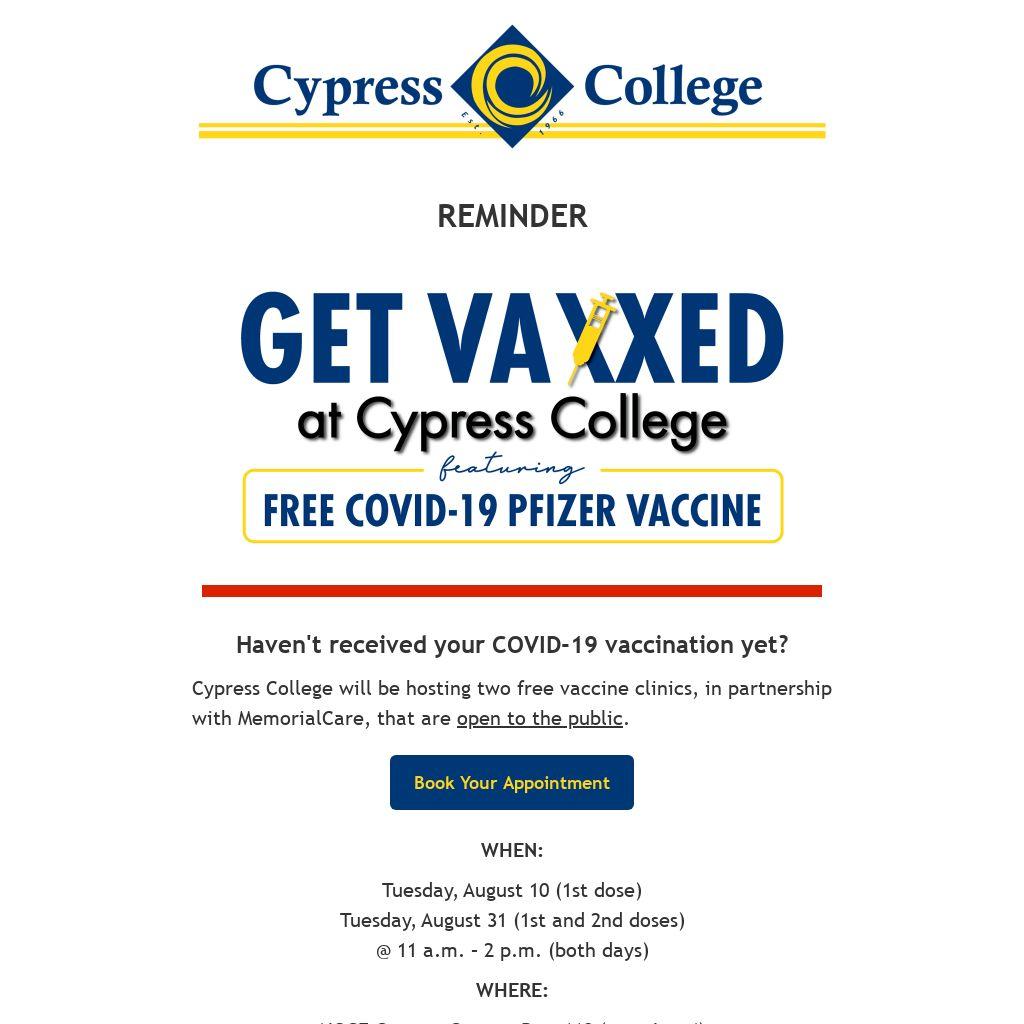 Cypress College will be hosting two free vaccine clinics, in partnership with MemorialCare, that are