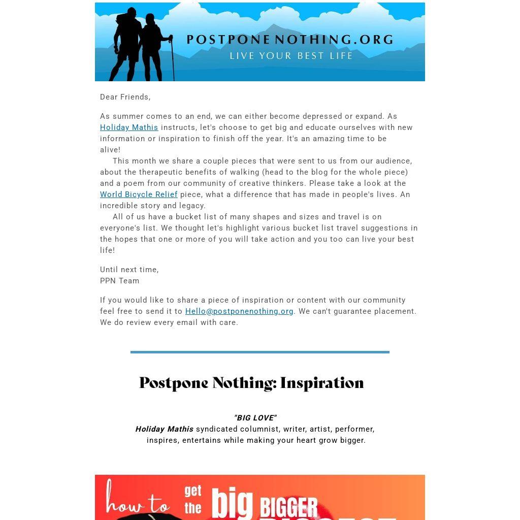 If you would like to share a piece of inspiration or content with our community feel free to send it to Hello@postponenothing.org. We can't guarantee placement. We do review every email with care.