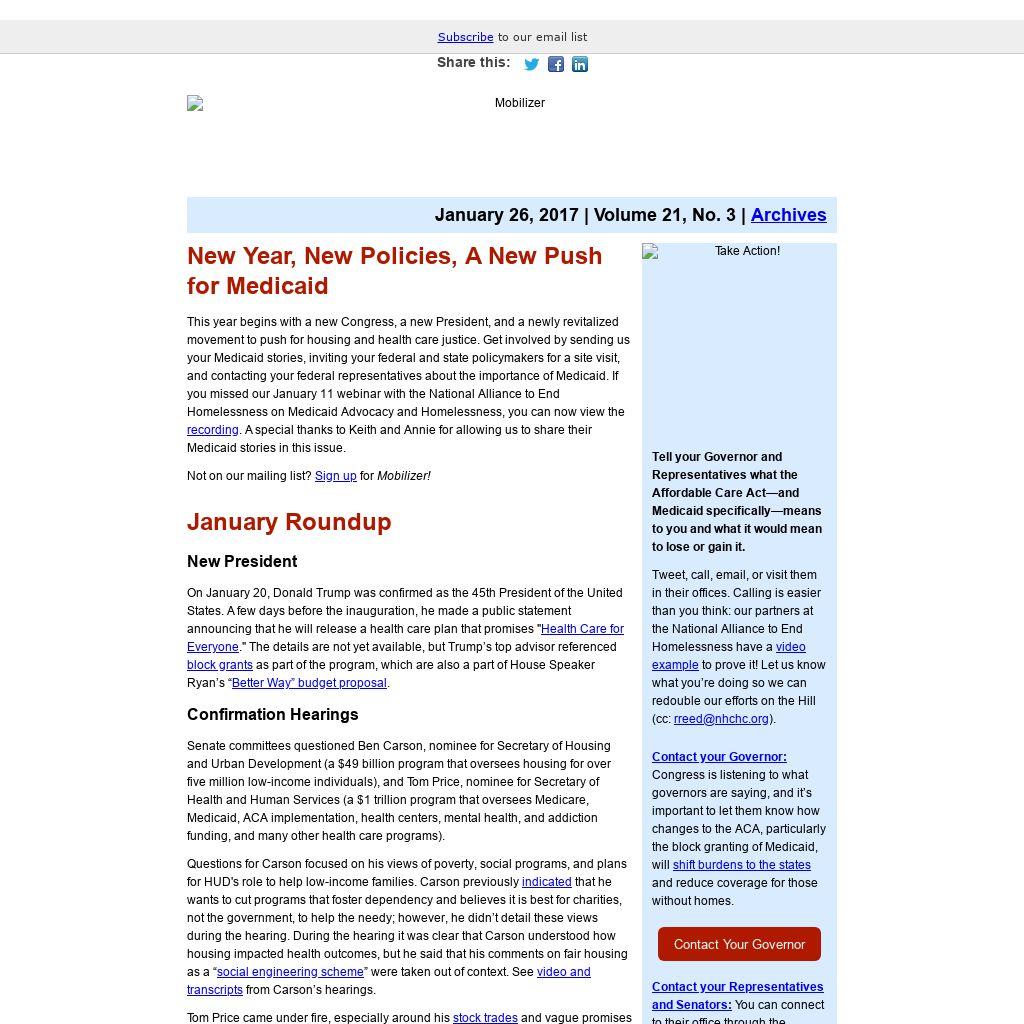 New Year, New Policies, A New Push for Medicaid This year begins with a new Congress, a new President, and a newly revitalized movement to push for housing and health care justice. Get involved by sending us your Medicaid stories, inviting your federal and state policymakers for a site visit, and contacting your federal representatives about the importance of Medicaid. If you missed our January 11 webinar with the National Alliance to End Homelessness on Medicaid Advocacy and Homelessness, you can now view the recording. A special thanks to Keith and Annie for allowing us to share their Medicaid stories in this issue.Not on our mailing list? Sign up for Mobilizer!