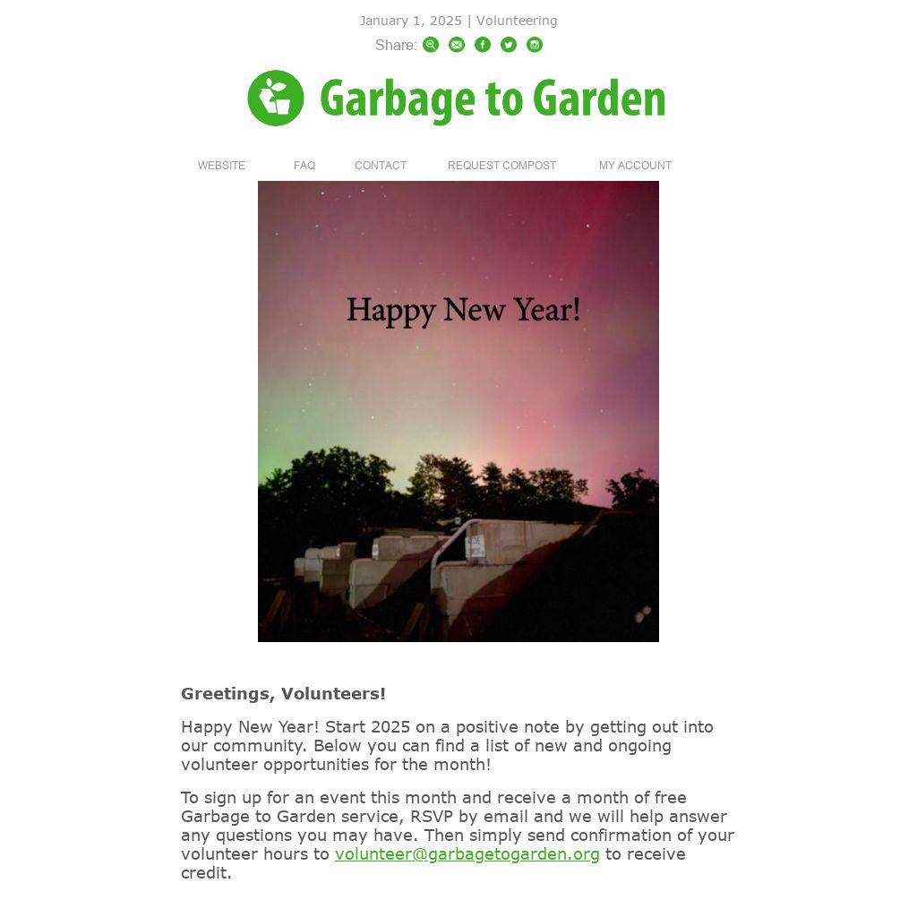 To sign up for an event this month and receive a month of free Garbage to Garden service, RSVP by email and we will help answer any questions you may have. Then simply send confirmation of your volunteer hours to volunteer@garbagetogarden.org to receive credit.