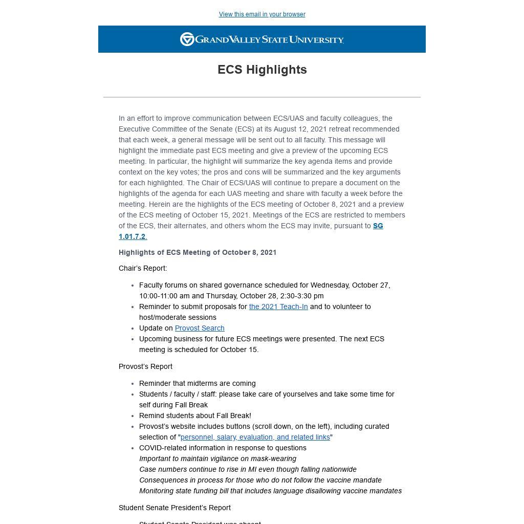 In an effort to improve communication between ECS/UAS and faculty colleagues, the Executive Committee of the Senate (ECS) at its August 12, 2021 retreat recommended that each week, a general message will be sent out to all faculty. This message will highlight the immediate past ECS meeting and give a preview of the upcoming ECS meeting. In particular, the highlight will summarize the key agenda items and provide context on the key votes; the pros and cons will be summarized and the key arguments for each highlighted. The Chair of ECS/UAS will continue to prepare a document on the highlights of the agenda for each UAS meeting and share with faculty a week before the meeting. Herein are the highlights of the ECS meeting of October 8, 2021 and a preview of the ECS meeting of October 15, 2021. Meetings of the ECS are restricted to members of the ECS, their alternates, and others whom the ECS may invite, pursuant to SG 1.01.7.2.