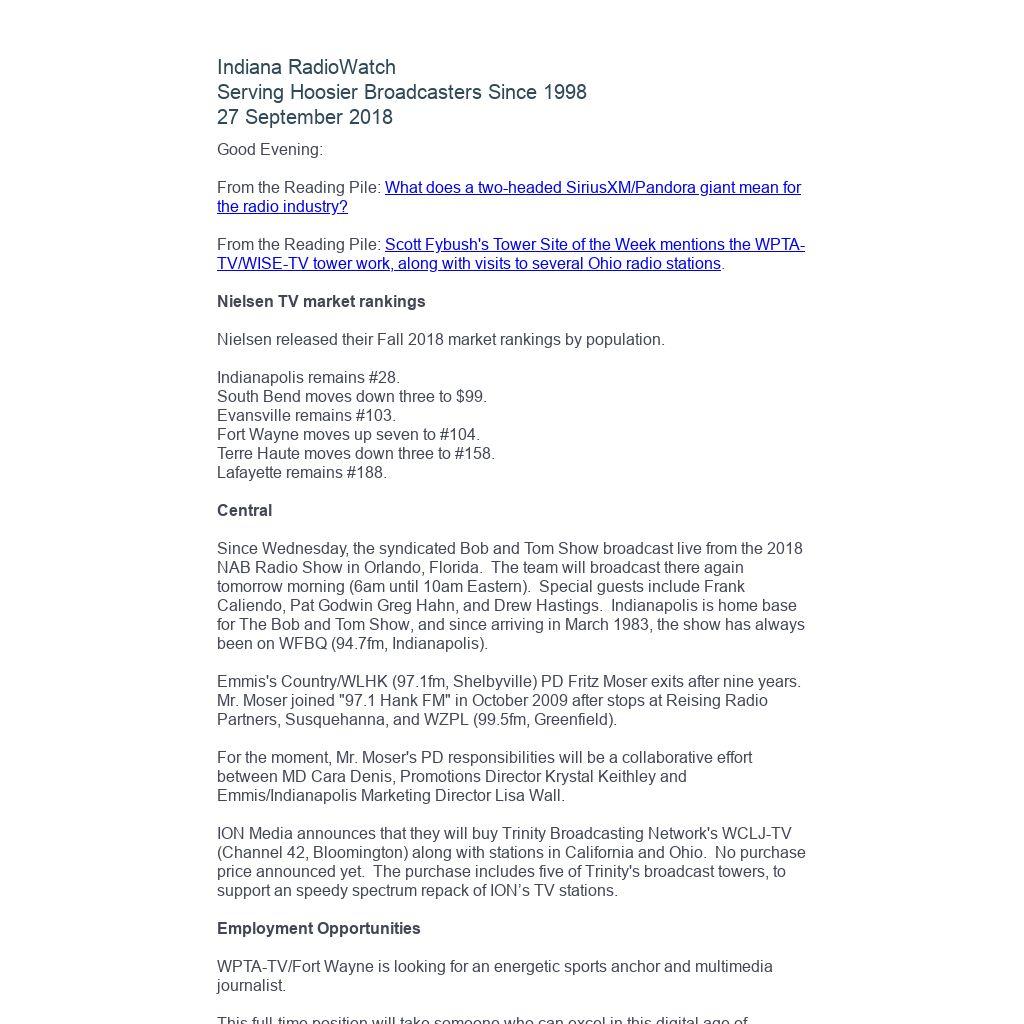 Indiana RadioWatch subscriptions are free. To subscribe, send an e-mail to irw@well.com and we'll add you. After publication, we archive Indiana RadioWatch on the Indiana Radio Archive at http://www.indianaradio.net. Please e-mail us your news stories and employment opportunities.
