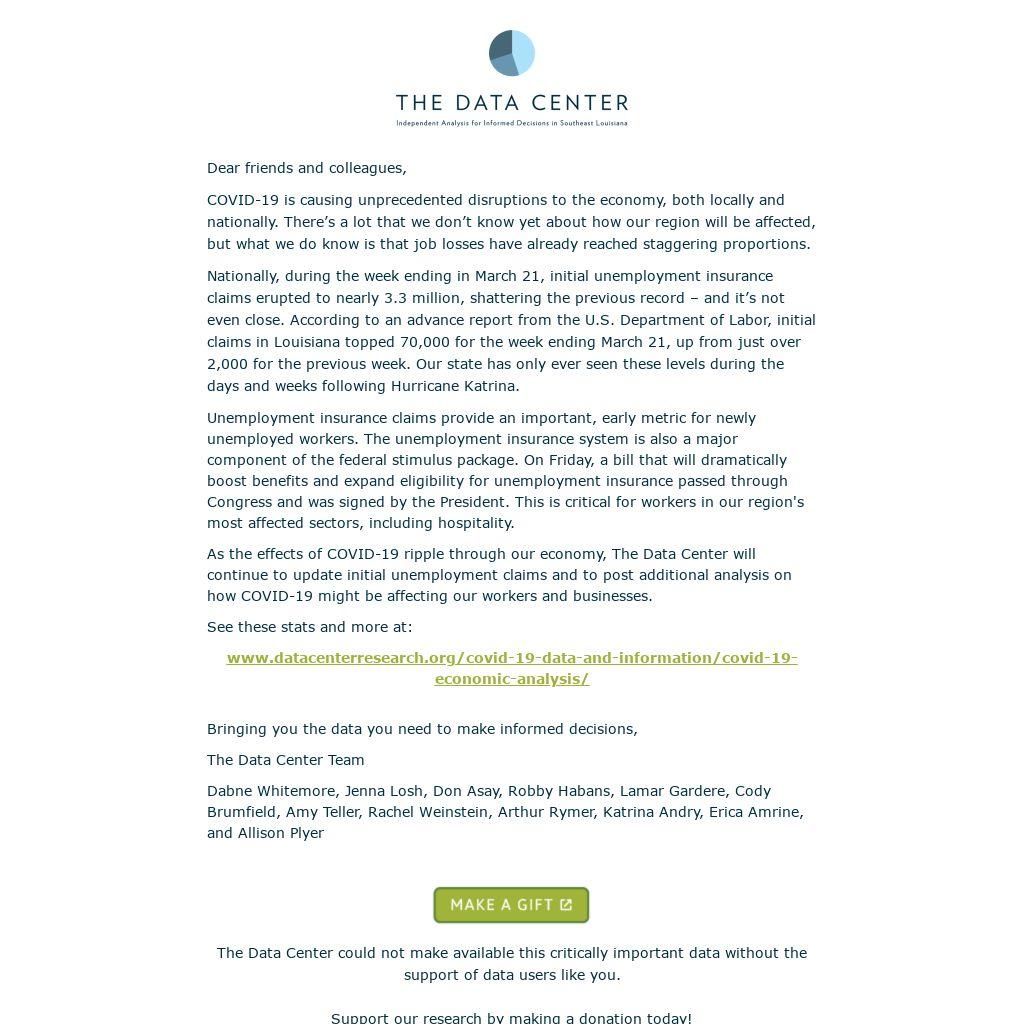 As the effects of COVID-19 ripple through our economy, The Data Center will continue to update initial unemployment claims and to post additional analysis on how COVID-19 might be affecting our workers and businesses.