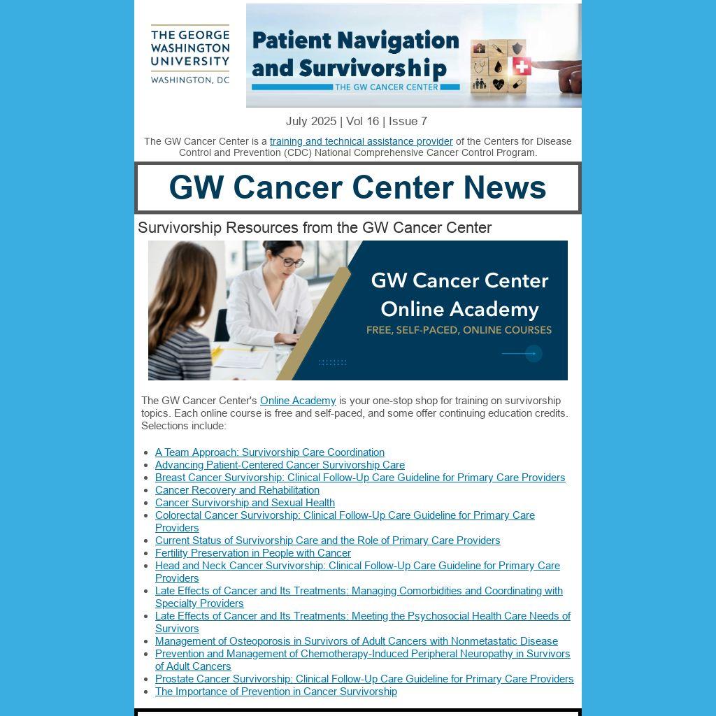The GW Cancer Center's Online Academy is your one-stop shop for training on survivorship topics. Each online course is free and self-paced, and some offer continuing education credits. Selections include:
