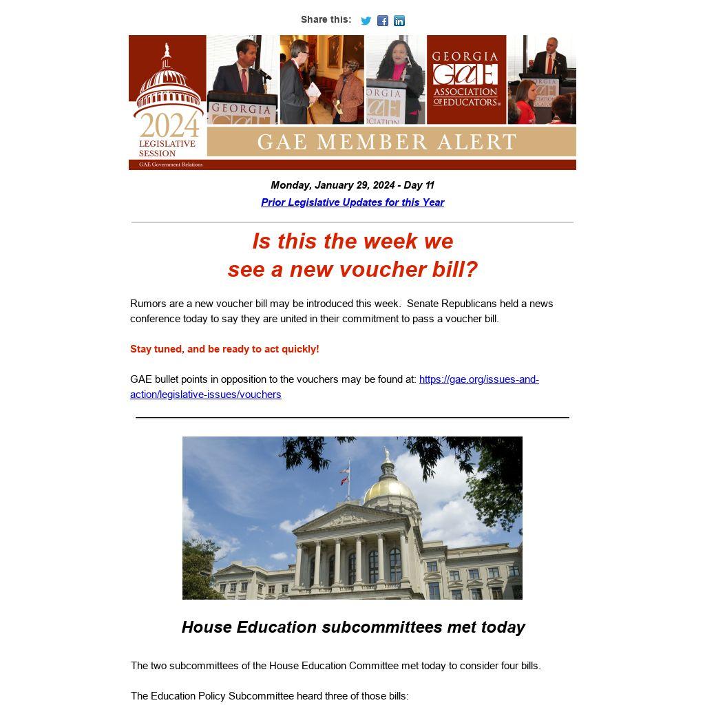 HB 846 would require local school systems to annually notify employees whether Social Security taxes will be withheld from their pay and whether they are eligible to be included in any other pension or retirement plan. The bill is offered by Rep. Rob Leverett, R-Elberton. GAE supports this legislation. The bill was held over until next week to make some minor changes to the legislation.