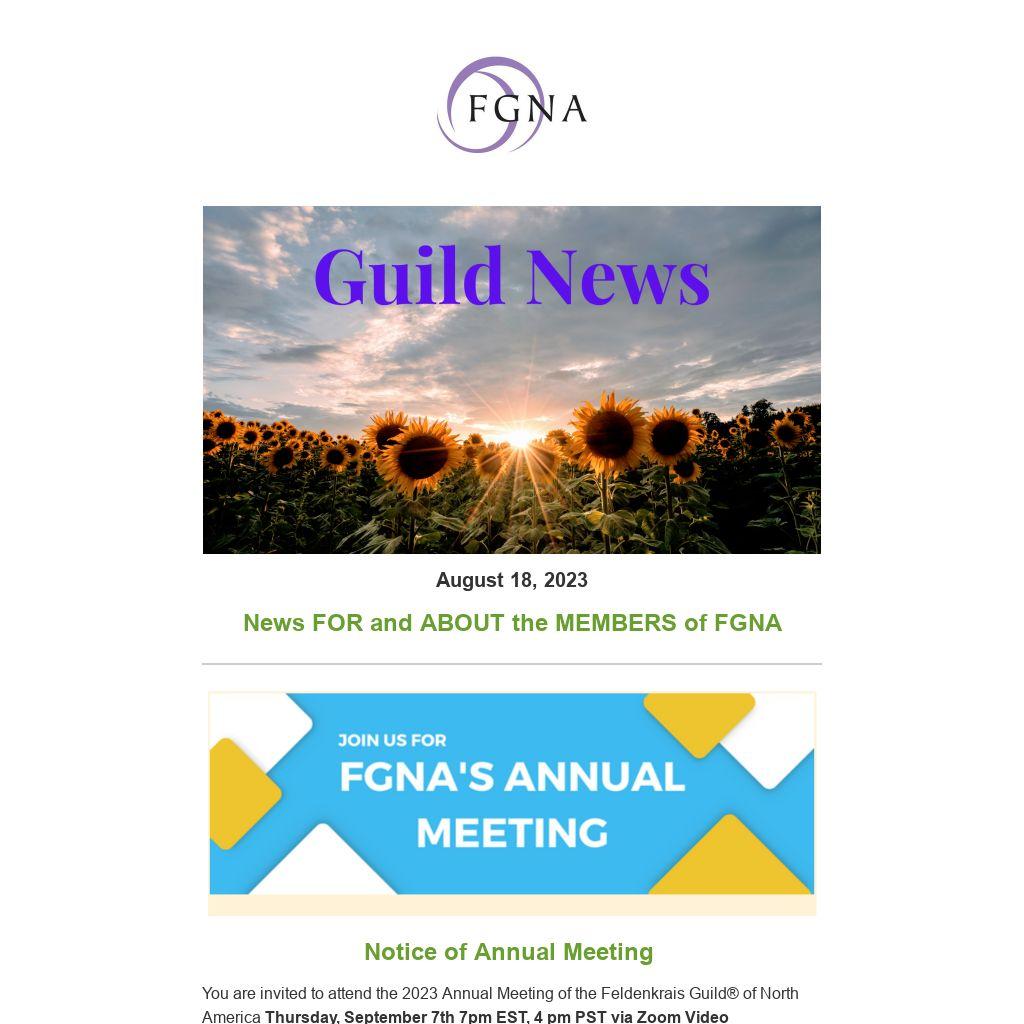 You are invited to attend the 2023 Annual Meeting of the Feldenkrais Guild® of North America Thursday, September 7th 7pm EST, 4 pm PST via Zoom Video Conference. The agenda will include: