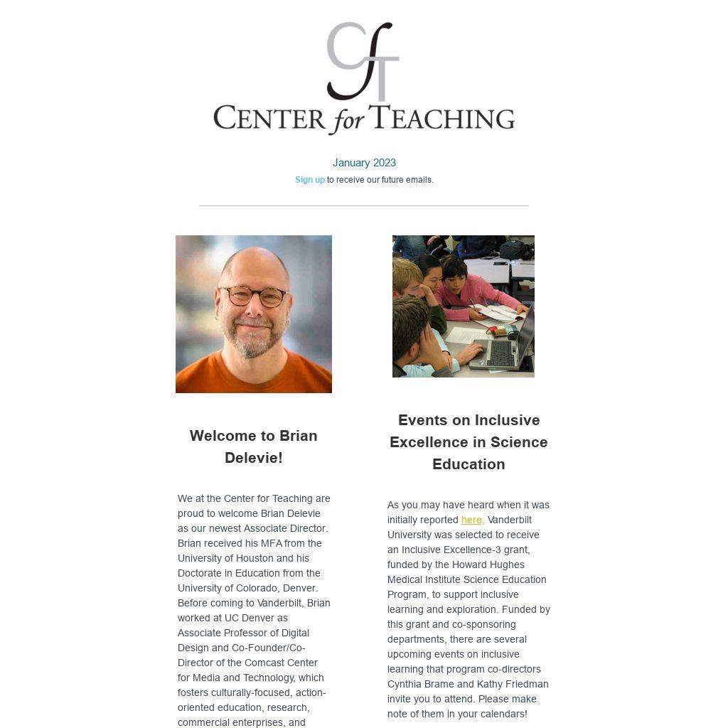 We at the Center for Teaching are proud to welcome Brian Delevie as our newest Associate Director. Brian received his MFA from the University of Houston and his Doctorate in Education from the University of Colorado, Denver. Before coming to Vanderbilt, Brian worked at UC Denver as Associate Professor of Digital Design and Co-Founder/Co-Director of the Comcast Center for Media and Technology, which fosters culturally-focused, action-oriented education, research, commercial enterprises, and community services. Brian has extensive teaching and administrative experience, and is an innovator at heart, traits that are sure to be an asset for all of us as he supports instructional and professional development across the disciplines. Beyond his academic interests, Brian also enjoys hiking, cooking, and music, particularly jazz. Please join us in welcoming Brian to Vanderbilt!