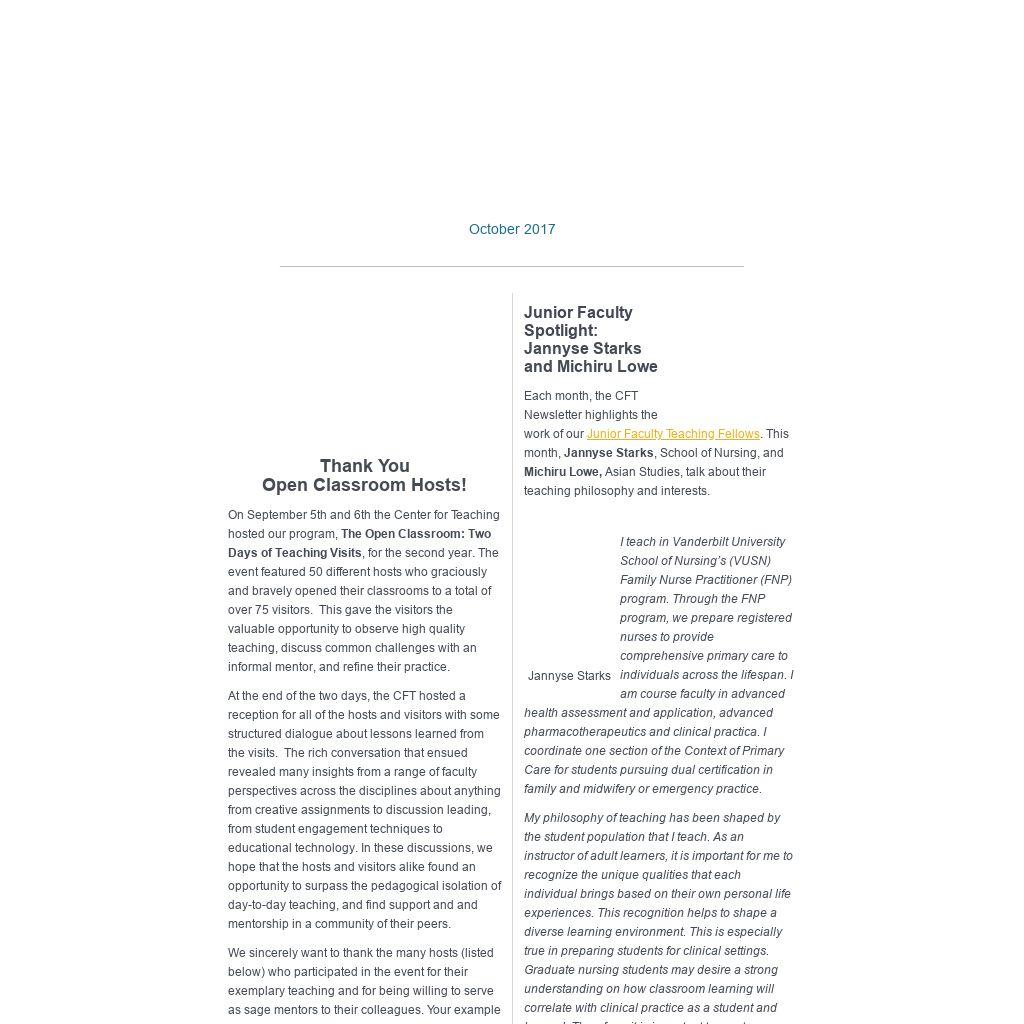 On September 5th and 6th the Center for Teaching hosted our program, The Open Classroom: Two Days of Teaching Visits, for the second year. The event featured 50 different hosts who graciously and bravely opened their classrooms to a total of over 75 visitors. This gave the visitors the valuable opportunity to observe high quality teaching, discuss common challenges with an informal mentor, and refine their practice. At the end of the two days, the CFT hosted a reception for all of the hosts and visitors with some structured dialogue about lessons learned from the visits. The rich conversation that ensued revealed many insights from a range of faculty perspectives across the disciplines about anything from creative assignments to discussion leading, from student engagement techniques to educational technology. In these discussions, we hope that the hosts and visitors alike found an opportunity to surpass the pedagogical isolation of day-to-day teaching, and find support and and mentorship in a community of their peers. We sincerely want to thank the many hosts (listed below) who participated in the event for their exemplary teaching and for being willing to serve as sage mentors to their colleagues. Your example and the community you help us to build through this program helps to sustain us at the CFT and to fulfill the teaching mission of Vanderbilt. Thank you.