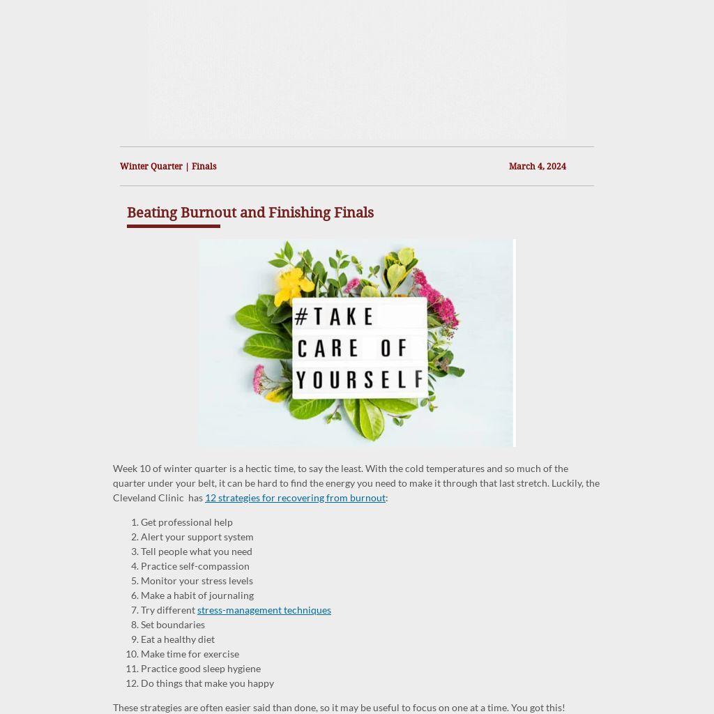 Week 10 of winter quarter is a hectic time, to say the least. With the cold temperatures and so much of the quarter under your belt, it can be hard to find the energy you need to make it through that last stretch. Luckily, the Cleveland Clinic has 12 strategies for recovering from burnout: