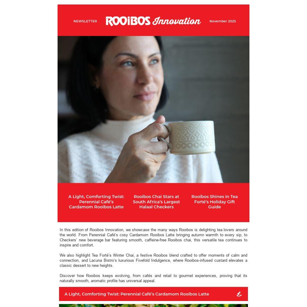 In this edition of Rooibos Innovation, we showcase the many ways Rooibos is delighting tea lovers around the world. From Perennial Café’s cosy Cardamom Rooibos Latte bringing autumn warmth to every sip, to Checkers’ new beverage bar featuring smooth, caffeine-free Rooibos chai, this versatile tea continues to inspire and comfort.