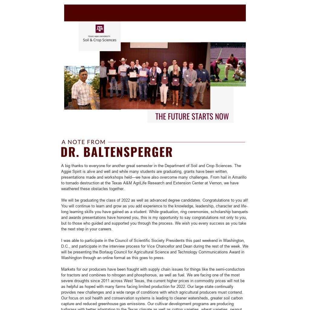 A big thanks to everyone for another great semester in the Department of Soil and Crop Sciences. The Aggie Spirit is alive and well and while many students are graduating, grants have been written, presentations made and workshops held—we have also overcome many challenges. From hail in Amarillo to tornado destruction at the Texas A&M AgriLife Research and Extension Center at Vernon, we have weathered these obstacles together.
