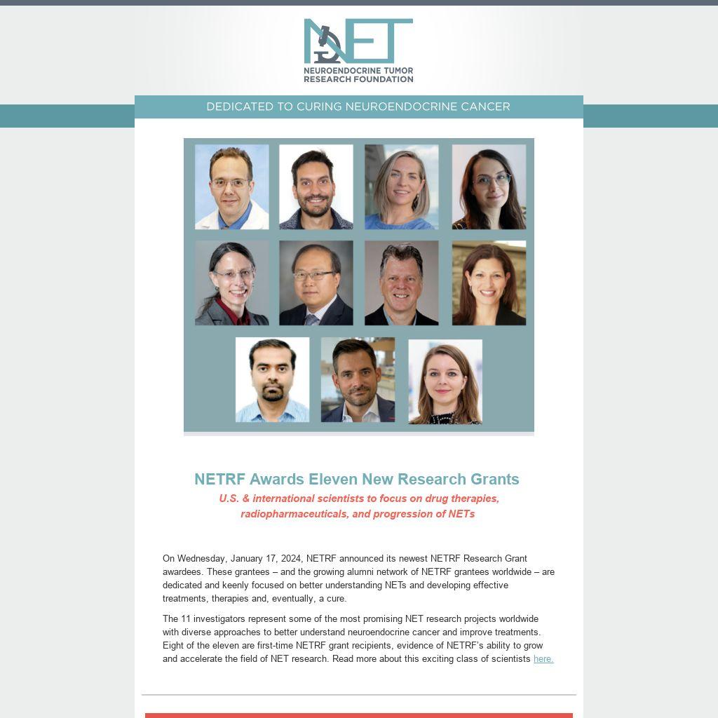 On Wednesday, January 17, 2024, NETRF announced its newest NETRF Research Grant awardees. These grantees – and the growing alumni network of NETRF grantees worldwide – are dedicated and keenly focused on better understanding NETs and developing effective treatments, therapies and, eventually, a cure.