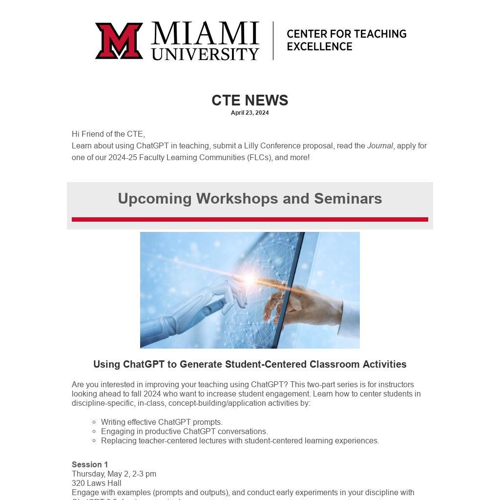 Learn about using ChatGPT in teaching, submit a Lilly Conference proposal, read the Journal, apply for one of our 2024-25 Faculty Learning Communities (FLCs), and more!