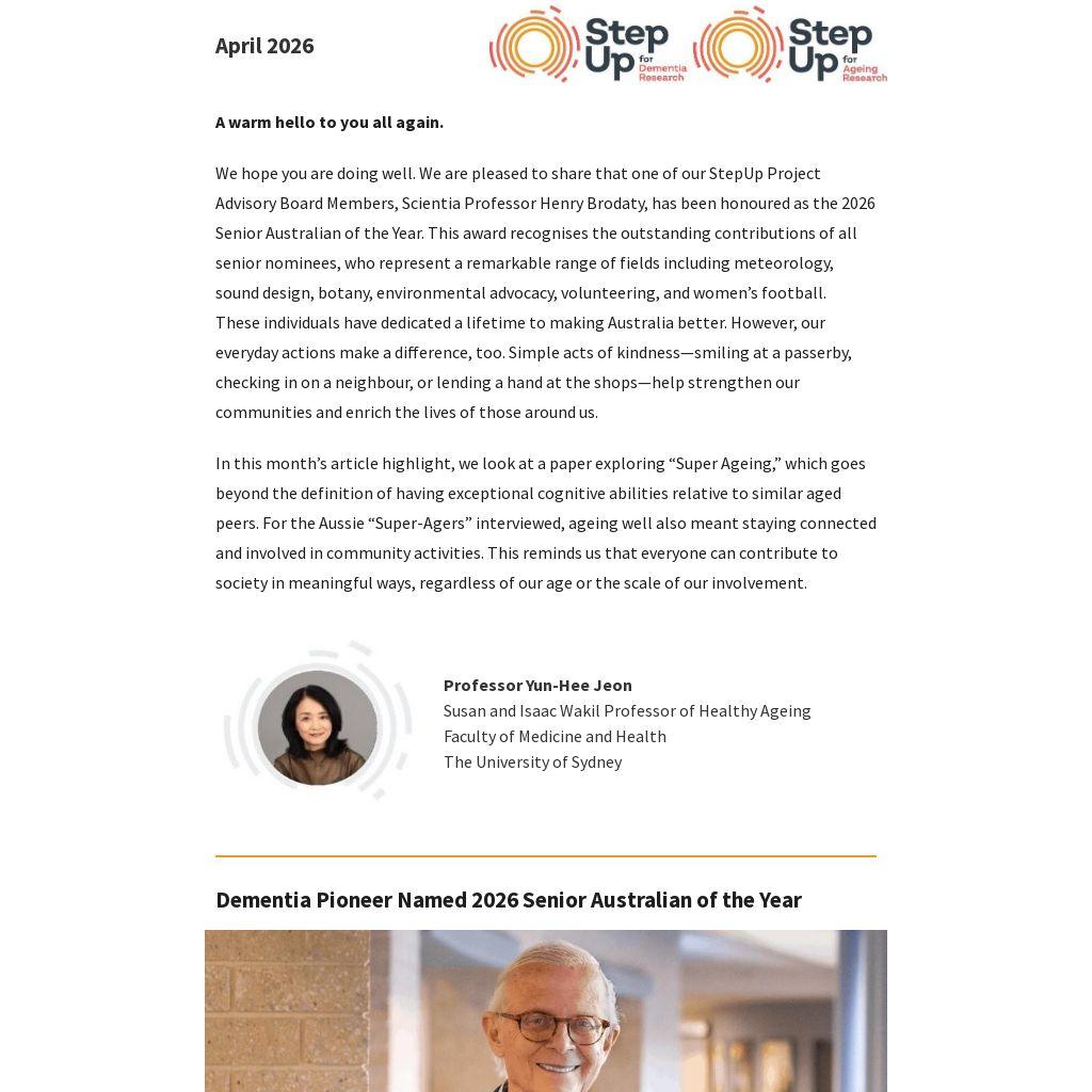 We hope you are doing well. We are pleased to share that one of our StepUp Project Advisory Board Members, Scientia Professor Henry Brodaty, has been honoured as the 2026 Senior Australian of the Year. This award recognises the outstanding contributions of all senior nominees, who represent a remarkable range of fields including meteorology, sound design, botany, environmental advocacy, volunteering, and women’s football. These individuals have dedicated a lifetime to making Australia better. However, our everyday actions make a difference, too. Simple acts of kindness—smiling at a passerby, checking in on a neighbour, or lending a hand at the shops—help strengthen our communities and enrich the lives of those around us.