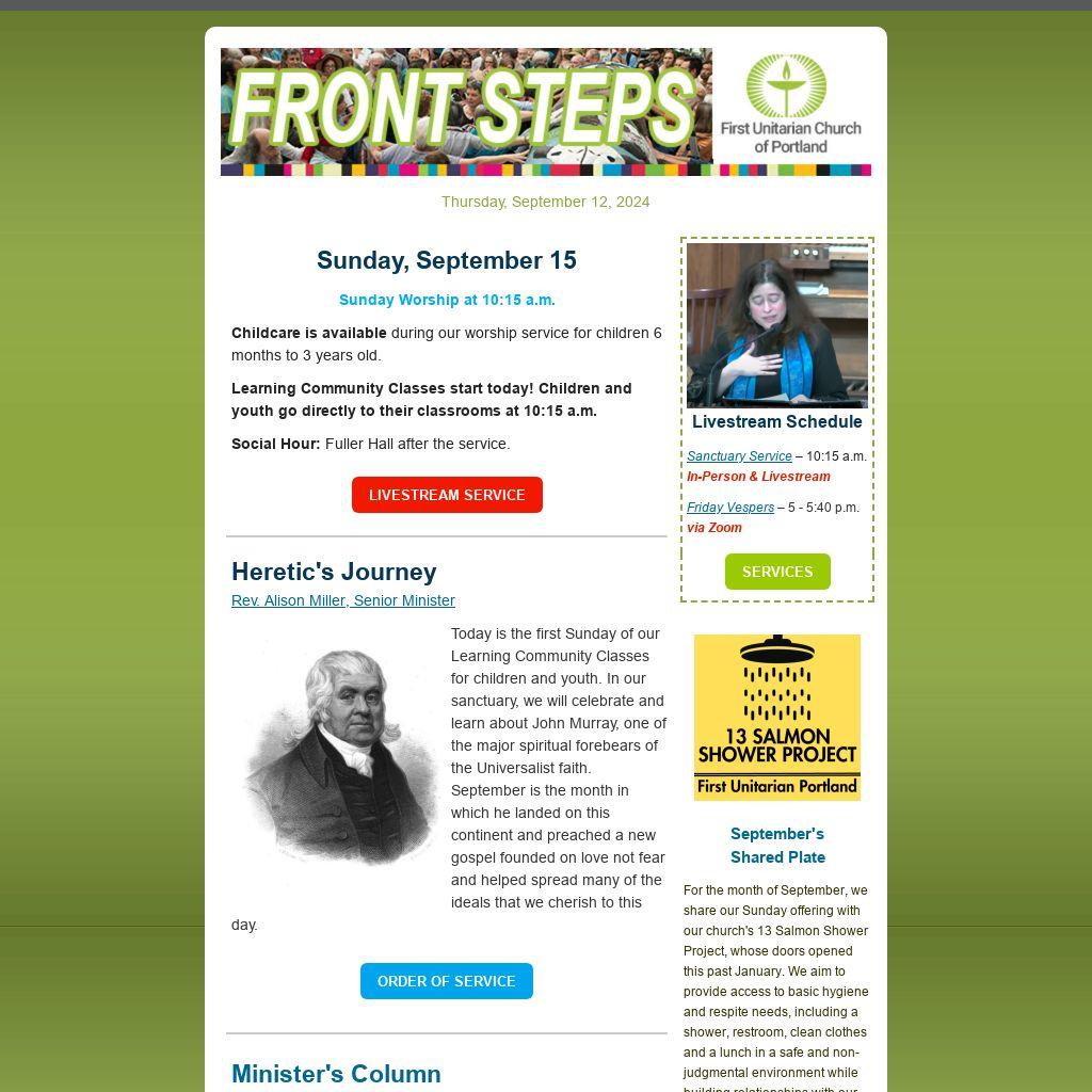 Got something for Front Steps? Send in your church-related submission for our weekly publication. Use "Front Steps" as the subject line and submit here.