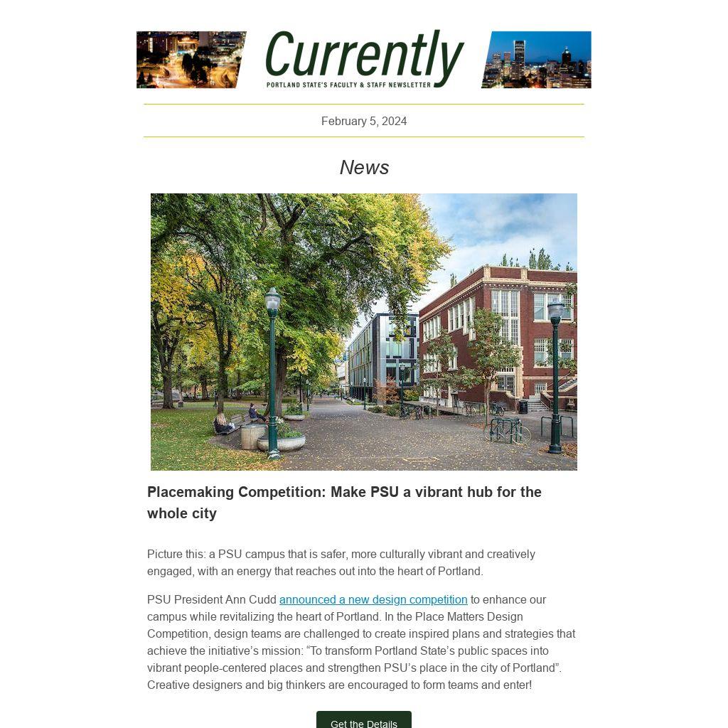CURRENTLY IS PUBLISHED online every Monday during the academic year. News items should be sent to the Office of University Communications (currently@pdx.edu) by noon the Tuesday before publication. See the Currently website for submission guidelines and schedule.