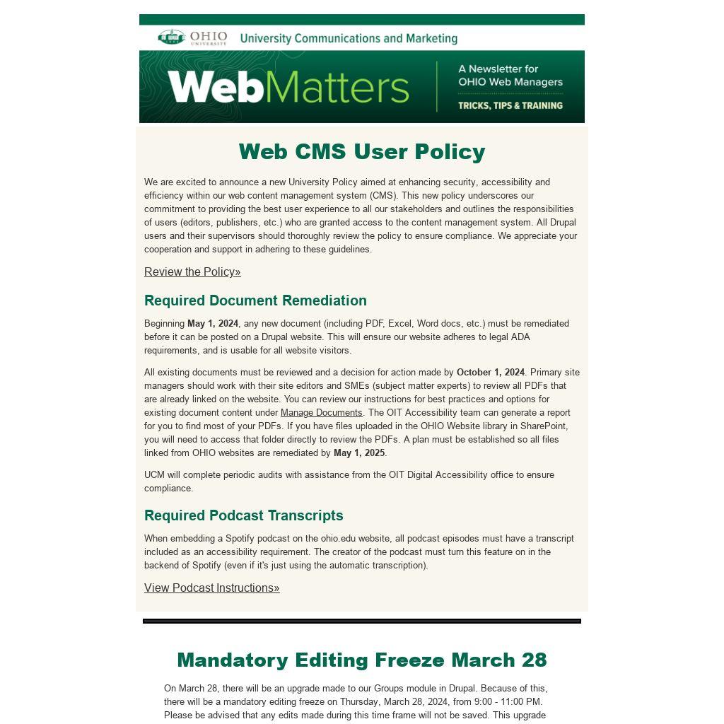 We are excited to announce a new University Policy aimed at enhancing security, accessibility and efficiency within our web content management system (CMS). This new policy underscores our commitment to providing the best user experience to all our stakeholders and outlines the responsibilities of users (editors, publishers, etc.) who are granted access to the content management system. All Drupal users and their supervisors should thoroughly review the policy to ensure compliance. We appreciate your cooperation and support in adhering to these guidelines.
