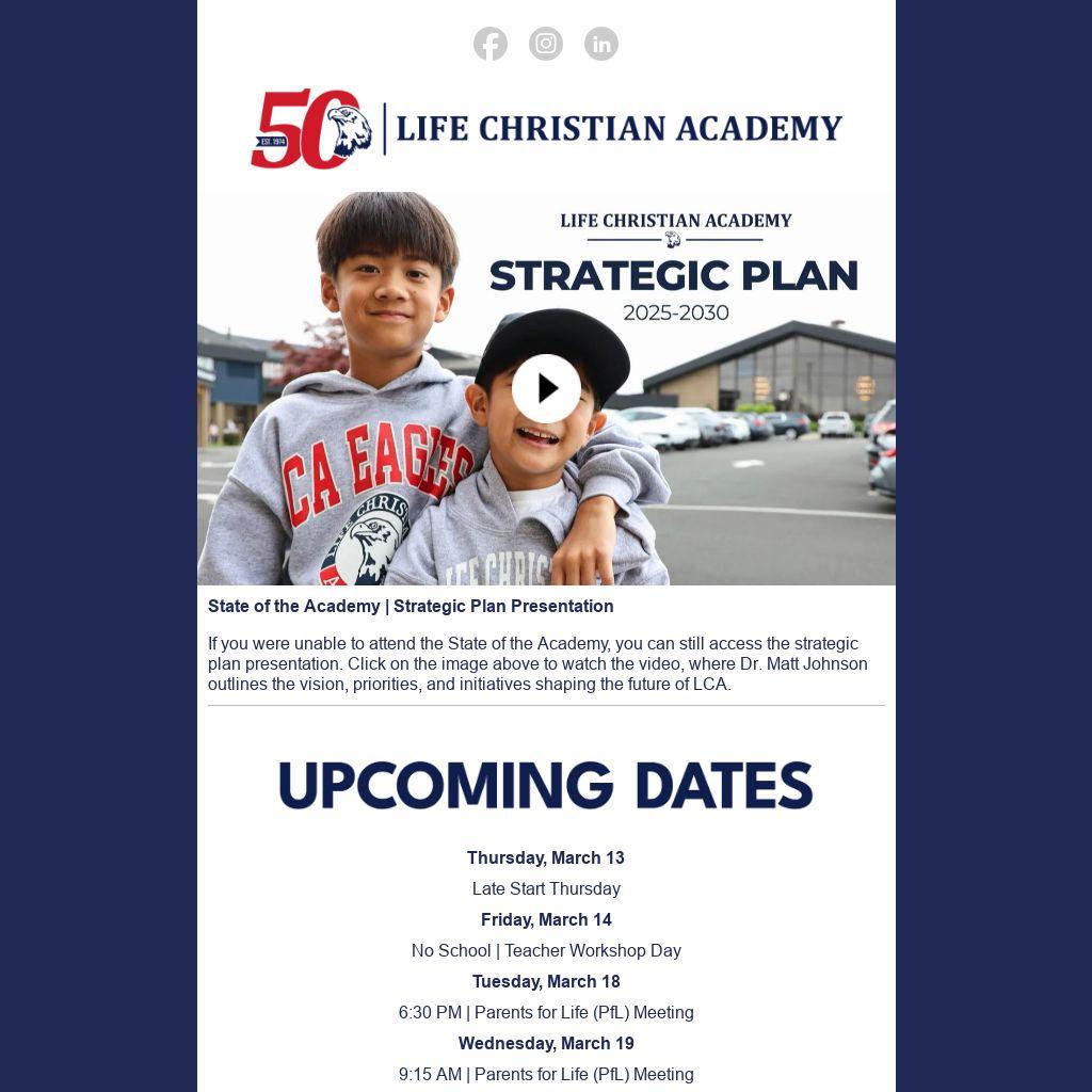 If you were unable to attend the State of the Academy, you can still access the strategic plan presentation. Click on the image above to watch the video, where Dr. Matt Johnson outlines the vision, priorities, and initiatives shaping the future of LCA.