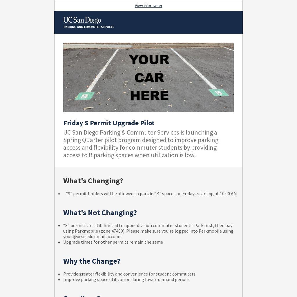 UC San Diego Parking & Commuter Services is launching a Spring Quarter pilot program designed to improve parking access and flexibility for commuter students by providing access to B parking spaces when utilization is low.