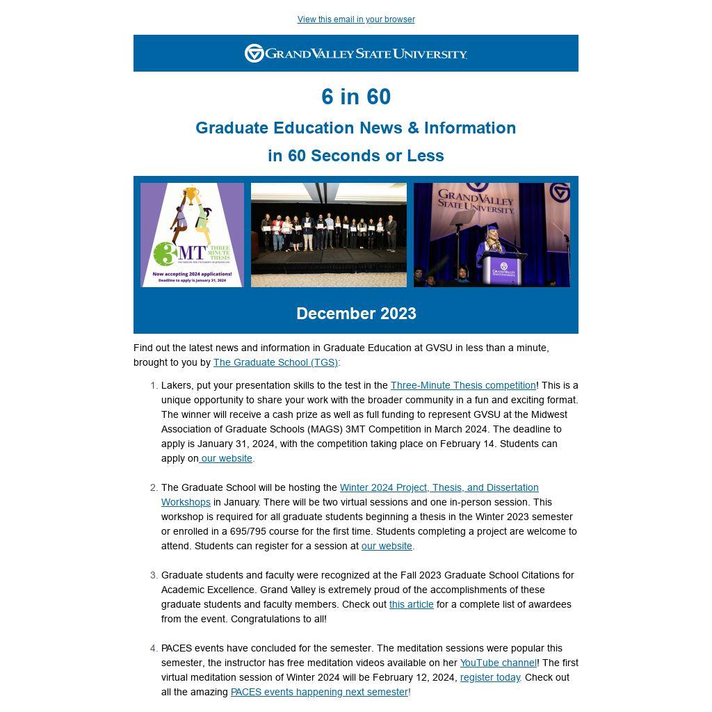 Find out the latest news and information in Graduate Education at GVSU in less than a minute, brought to you byThe Graduate School (TGS):