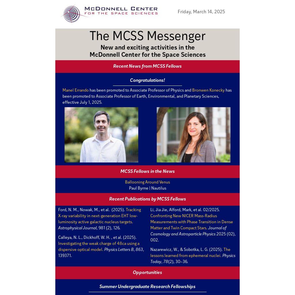 This fellowship is geared toward undergraduate students who may be considering graduate school. McDonnell Center faculty fellows guide the student on a specific space-science-related research project during the summer. Students interested in applying should discuss potential research with a McDonnell Center faculty member. The term is for ten weeks in the upcoming summer.